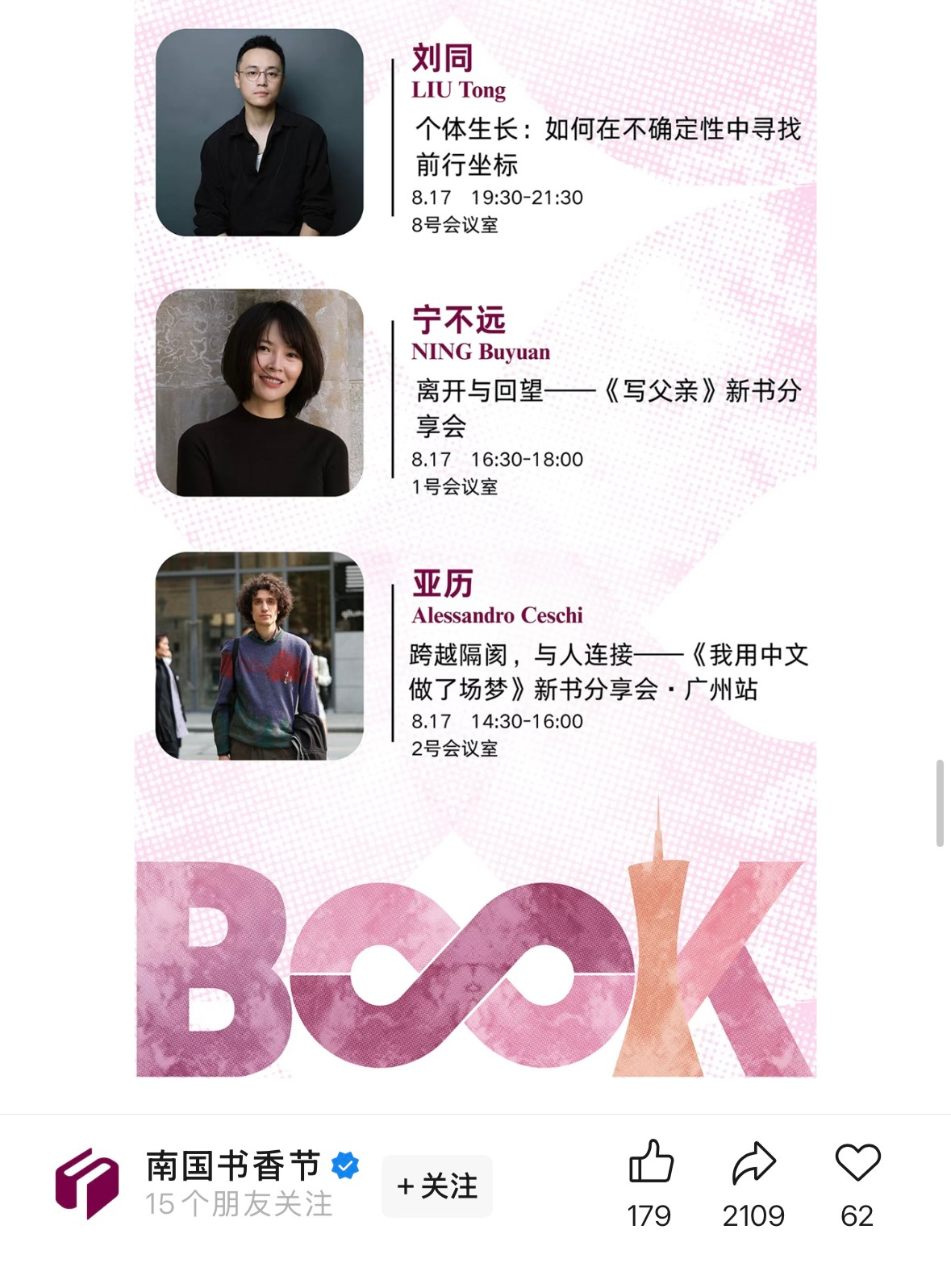 广州 · 南国书香节8月17号广交会见!Alessandro CeschiAug 07, 2025Shareciao!南国书香节即将在广州的广交会展开,我也会在的~欢迎大家扫描海报了解书香节所有的活动,我会在8月17号的下午两点做分享。和大家介绍一下预约活动的流程:1、登记相关信息后会有二维码 进展馆前出示该二维码即可;2、可在同一链接上预约活动,预约成功后会有对应的二维码,活动开始前的半个小时开始核验报名码;3、现场有新书可以购买。今天(8月7号)18点书香节会二次开票。期待和大家在书香节见面!祝好,ale